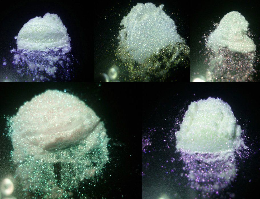 Interference Pigments are made by coating mica with titanium dioxide. These powders might appear to look just white, but when viewed at an angle, beautiful iridescent colors start dancing in the light!